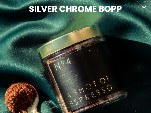 Silver Chrome is a highly reflective material that is water, oil, and moisture resistant. If you are looking for a subtle touch of spot metallic* on your label, this is the choice. Unlike Silver BOPP, it is not recommended for fully metallic labels.